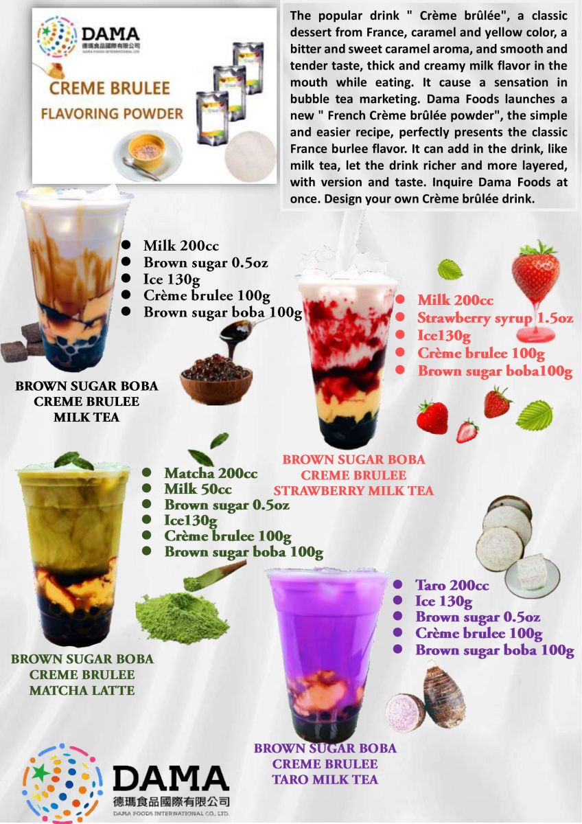 The popular drink " Crème brûlée", a classic dessert from France, caramel and yellow color, a bitter and sweet caramel aroma, and smooth and tender taste, thick and creamy milk flavor in the mouth while eating. It cause a sensation in bubble tea marketing. Dama Foods launches a new " French Crème brûlée powder", the simple and easier recipe, perfectly presents the classic France burlee flavor. It can add in the drink, like milk tea, let the drink richer and more layered, with version and taste. Inquire Dama Foods at once. Design your own Crème brûlée drink.