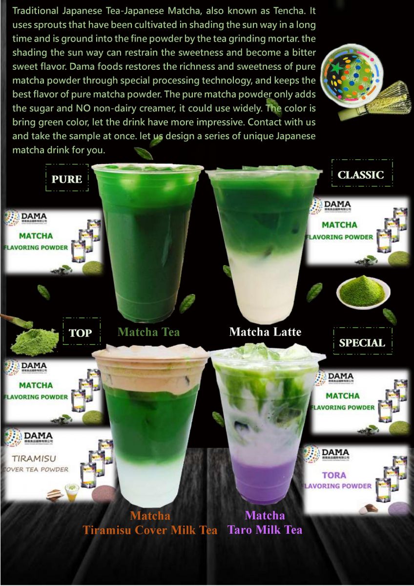 Traditional Japanese Tea-Japanese Matcha, also known as Tencha. It uses sprouts that have been cultivated in shading the sun way in a long time and is ground into the fine powder by the tea grinding mortar. the shading the sun way can restrain the sweetness and become a bitter sweet flavor. Dama foods restores the richness and sweetness of pure matcha powder through special processing technology, and keeps the best flavor of pure matcha powder. The pure matcha powder only adds the sugar and NO non-dairy creamer, it could use widely. The color is bring green color, let the drink have more impressive. Contact with us and take the sample at once. let us design a series of unique Japanese matcha drink for you.