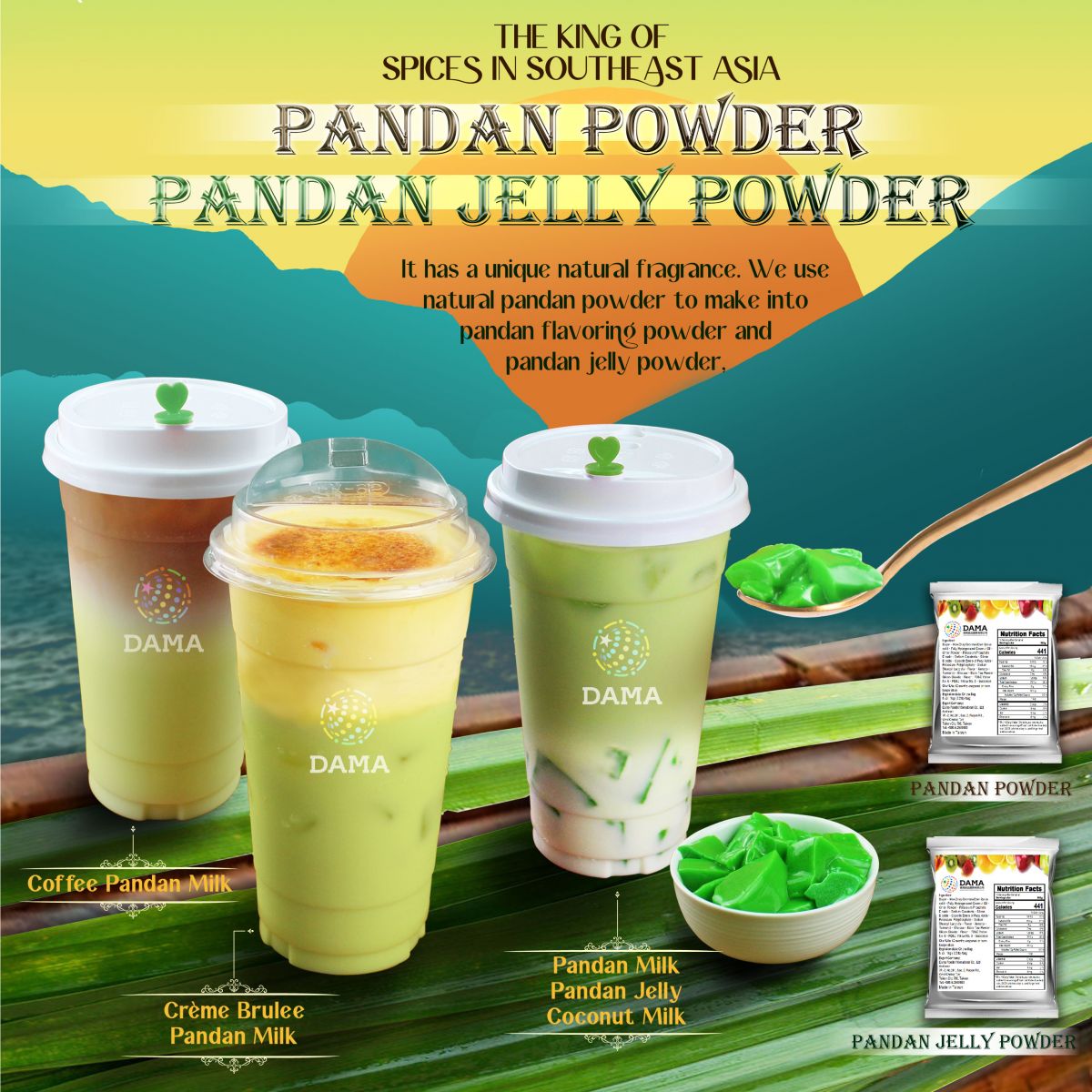 We use pure natural pandan powder to make into pandan flavoring powder and pandan jelly powder, showing its