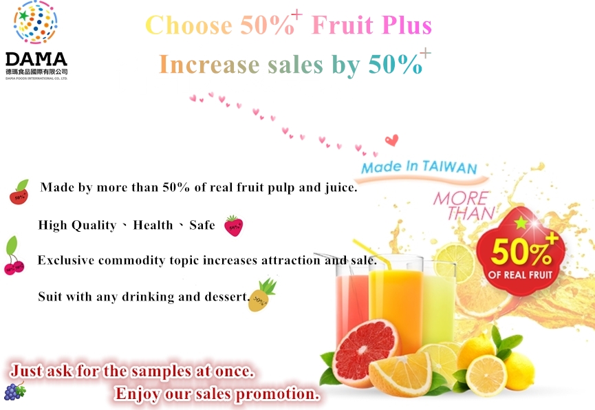 DAMA Foods provides a wide selection of products and services. In addition to the existing products on the market, we strongly suggest the 50%+ Fruit Plus to our customers. DAMA Food strongly promotes the product mix contains more than 50% of real fruit pulp and juice and use the qualities of fruits cultivated from the tropical island of Taiwan. It is the best choose for the fruit ice tea、smoothie, soda, topping...etc. Choose 50%+Fruit Plus, Increase sales by 50%+.