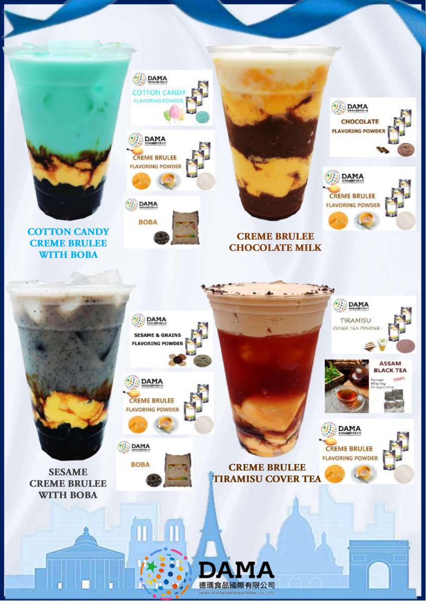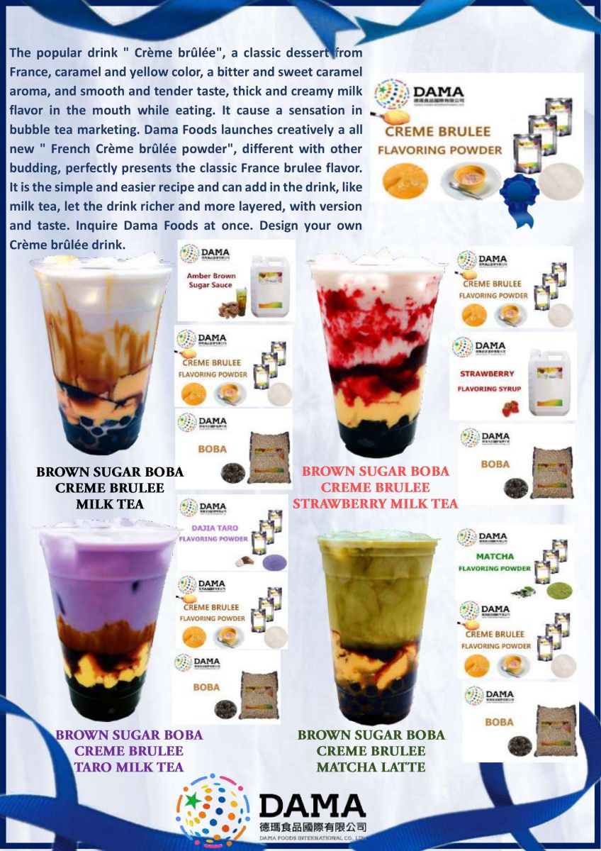 源自法國的經典甜點,超人氣系列飲品,「法式烤布蕾系列」,微焦鮮黃的誘人色澤,苦澀甜味的焦糖香氣,一起入口後在嘴中散發出濃郁綿密的奶香,迅速在飲料界中掀起一陣風暴,德瑪食品創新推出法式烤布蕾風味粉,別於一般布丁,完美詮釋法式經典布蕾軟嫩綿密的口感以及風味,作法簡單,且加入奶茶以及飲品中,讓風味更加豐富有層次,視覺與口感兼具,趕快與我們聯繫並索取樣品,設計一系列專屬於您的「法式烤布蕾」系列飲品。