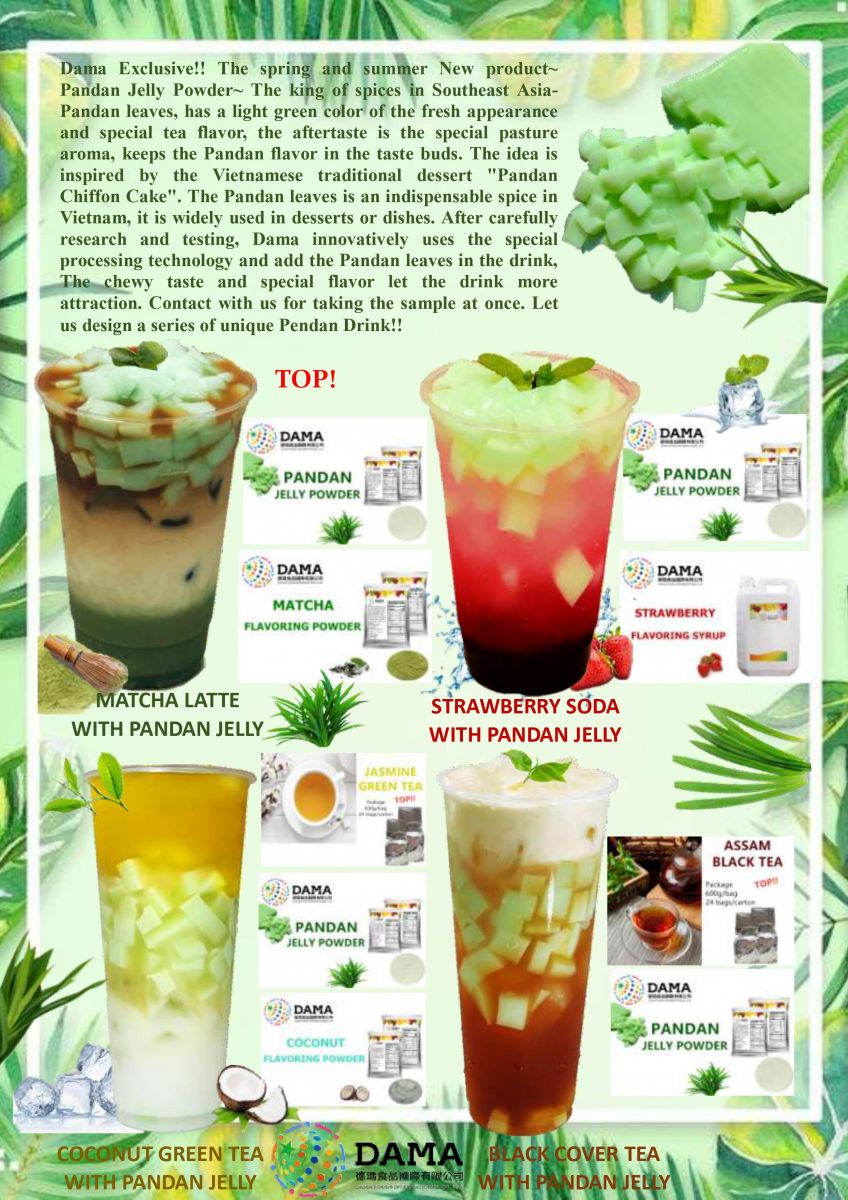 德瑪首創,春夏季特色新品「班蘭凍粉」霸氣登場,譽有東南亞香料之王的「班蘭葉」,淡綠色的清新外觀以及特殊的茶香氣,尾韻是特殊的牧草香,將班蘭深刻的留在味蕾裡,靈感取自於越南當地的傳統甜點「斑斕蛋糕」,班蘭葉在越南是不可或缺的香料,搭配性多元,常應用於甜點或者料理上,德瑪創新經過精心研發測試後,使用特殊加工技術,將斑蘭葉導入飲品中,Q彈的口感以及特殊的香氣讓飲品更添風采,趕快與我們聯繫索取樣品,讓我們為您設計一系列獨一無二的斑蘭系列飲品!!