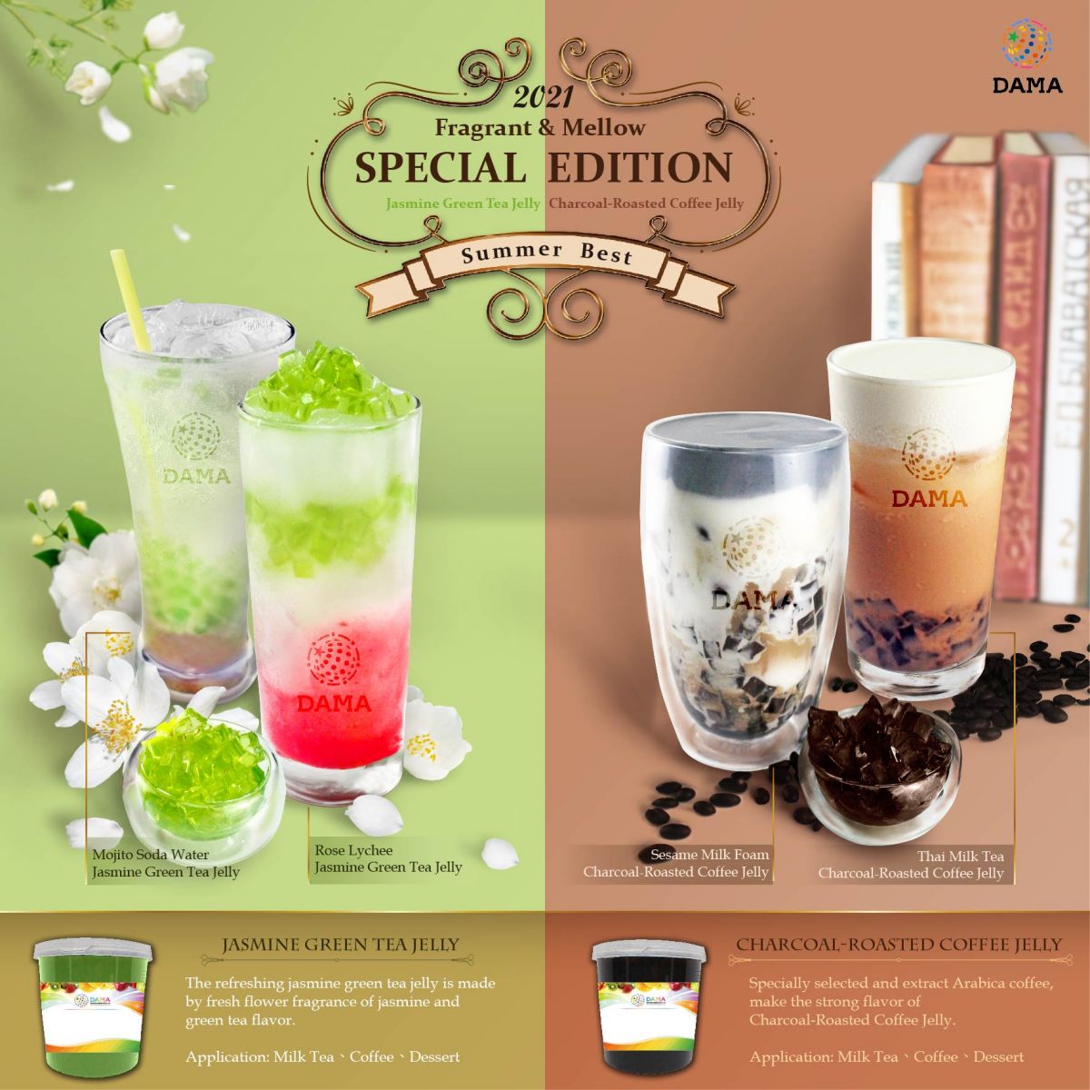 茉莉花綠茶Jelly,含有清新的茉莉花香氣與自然的綠茶風味,適合搭配各式茶類與冰沙飲品. 茉莉花有愛情的象徵, 使您的飲品有著浪漫又純潔的美麗呈現. 炭燒咖啡Jelly, 特選阿拉比卡咖啡萃取製成, 濃厚且醇香的咖啡風味,適合搭配各式奶類飲品與冰沙飲品. 深度的層次, 值得您花點時間細細品嘗,度過一個悠閒與慵懶的時光. 請您與我們聯繫, 試試這兩款全新的特殊風味,並且也讓您的消費者愛不釋手吧.